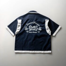 Boxy workshirt made of drill material in navy blue with simple typography illustration in classic style, using chain stitch embroidery technique.