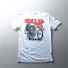 White T-shirt with wolf and chopper motorcycle illustration, showing the wild side of the true custom culture biker spirit.