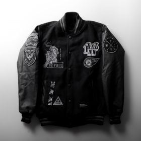 Varsity jacket with front and sleeve phillipworks embroidery patches details. With all functions of the varsity and a warm polyester fill, this jacket was specially designed to prepare you for chilly temperatures.